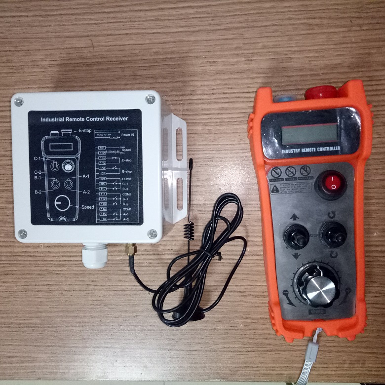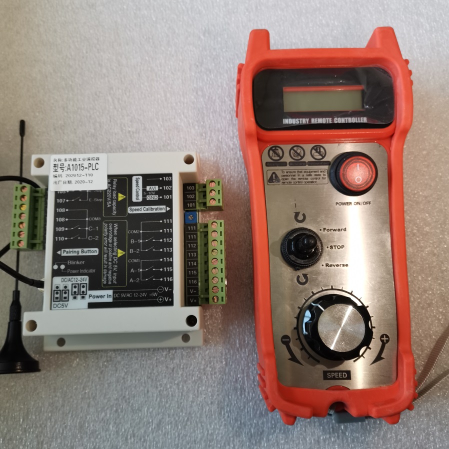 $ 遙控器手持機體積小,采用鈕子開關和大旋鈕速度調節(jié),方便工人單手戴手套操作。