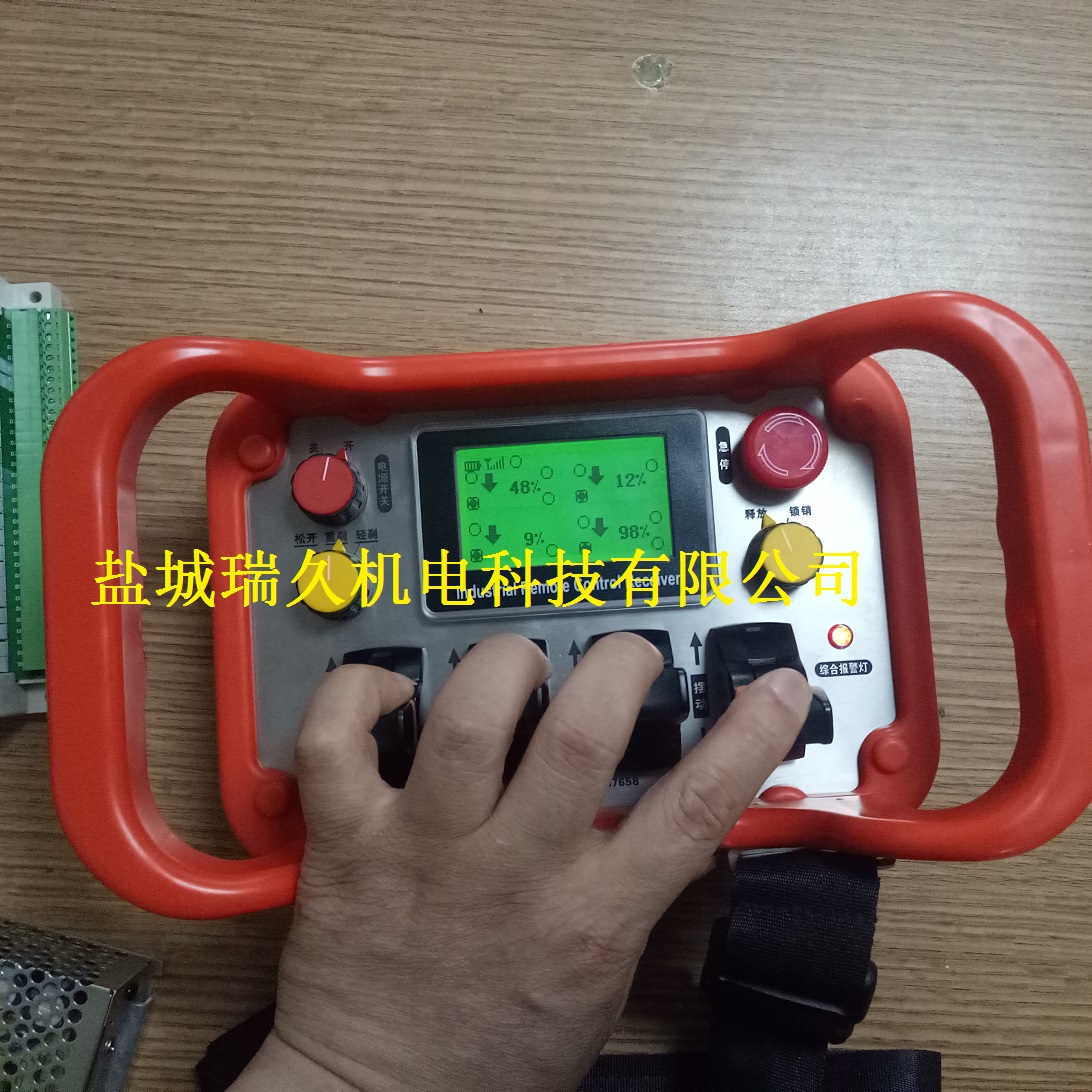 遙控器發(fā)射器采用腰跨式結構,三位兩通手動復位撥鈕開關1只,兩位一通手動復位旋鈕電源開關1只,兩位兩通手動復位旋鈕開關1只,蘑菇頭急停按鈕1只。霍爾模擬量推桿4只,各輸出1組0-10V及正反兩個繼電器常開點。遙控距離>150米,接收器電源電壓:DC24V。遙控器包含發(fā)射器和接收器各1只。