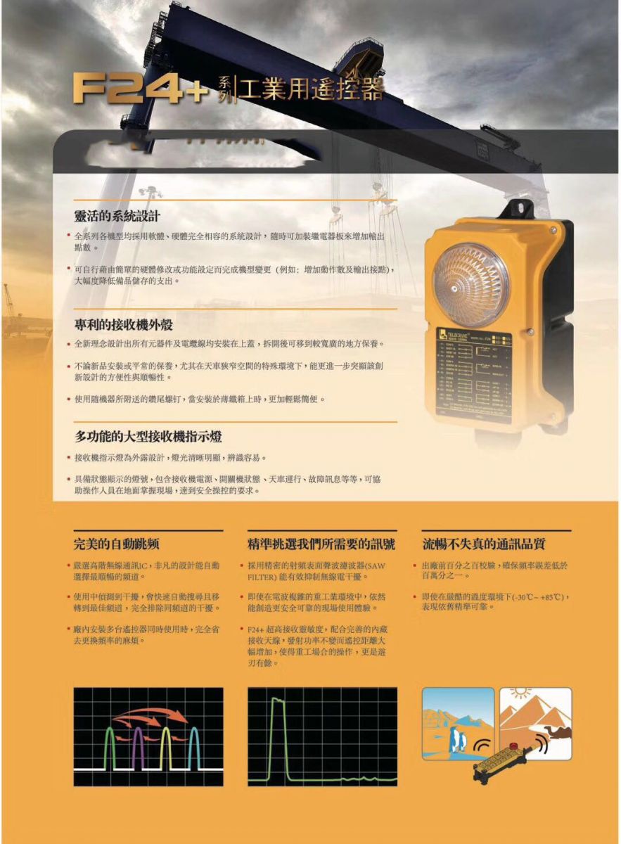 品牌:臺灣禹鼎 型號:F24-10S+ 配件適用對象:塔吊 起重機 工程機械 工業(yè)自動化控制 詳細說明 禹鼎工業(yè)遙控器F24-10S+ 產 品 性 能 指 標 十只功能按鍵(一段式按鍵)+蘑菇頭急停+啟動鑰匙+備用 發(fā)射器(手持)尺寸:245x61x51mm(含天線) 重量:約246克 接收機 尺寸:234x116x130mm 重量:1240克(不含電纜線) 電壓:36/220/380VAC 一般規(guī)格: *操作溫度:-30~+85攝氏度 *最大操作距離:100米 *發(fā)射機電源:AA堿性電性×2 *收發(fā)機電源:AC48/110/220/380V(可選擇)DC 12~24V *防護等級:IP65 *識別碼:43位組不重復識別碼(32位元) *漢明碼:≥20 *尼能加織的強化塑膠外殼,可防止摔落及強力碰撞所造成之損壞 *IP65防水防塵等級。 *全系列硬件/軟件完全相容,可節(jié)省庫存支出 *低耗電(使用兩顆AA堿性電池平均使用壽命可達2個月) *可經由PC軟件設定多種按鍵功能(與Win98/ME/2000/XP相容),能完全滿足各種操作要求 *接收機含輸出電纜線,安裝簡單、快速。 *多重安全保護設計:漢明碼、看門狗線路、32位元不重復識別碼。 適用于5個機構電動單梁雙梁小車雙鉤起重機、橋式起重機、門式起重機、碼頭吊、懸臂吊等起重設備和其他五機構正反轉控制設備,以及10個開關量控制的液壓、氣動工業(yè)設備。