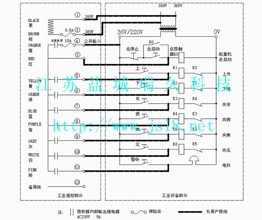 可選配外接延長天線將天線引至控制箱外 https://item.taobao.com/item.htm?ft=t&id=628753858754 臺灣禹鼎起重機(jī)遙控器F21-E1B 操作說明: *具有8只操作按鍵,其中6只單速按鍵,1個(gè)啟動(dòng)/警鈴,1只總停 *控制點(diǎn)數(shù)達(dá)6個(gè) *帶有電池電壓警示裝置,在電壓不足時(shí)能自行切斷電路。 *安全鑰匙開關(guān),防止未授權(quán)者使用。 *可由電腦接口設(shè)定內(nèi)部功能 *上/下、東/西、南/北可設(shè)定為是否互相抑制。 *備用1鍵可設(shè)定為開機(jī)、加速、捺跳、普通等功能。 臺灣禹鼎起重機(jī)遙控器F21-E1B 規(guī)格參數(shù): 控制距離:可達(dá)100米 安全碼:43億種以上出廠永不重復(fù) 使用溫度:-25℃至+70℃(不考慮電池耐溫) 防護(hù)等級:IP65 發(fā)射器電源:直流3V(2節(jié)堿性5號電池可使用4個(gè)月) 接收器電源:交流380V/220V/36V可選擇,或直流12V/24V 輸出觸點(diǎn)容量:5安培全密封式繼電器輸出(使用交流250V/10A繼電器,5安培保險(xiǎn)絲)。 臺灣禹鼎起重機(jī)遙控器F21-E1B 標(biāo)準(zhǔn)配置: *發(fā)射器1支(含背帶) *接收機(jī)1部 *接收機(jī)自帶1米連接電纜 *操作及維護(hù)手冊1本 臺灣禹鼎起重機(jī)遙控器F21-E1B 用途:適用于單鉤、單速電動(dòng)葫蘆或葫蘆式行車,MD型電動(dòng)葫蘆,不帶大車的固定式行車及6個(gè)接點(diǎn)以下的工業(yè)控制遙控用。 臺灣禹鼎起重機(jī)遙控器F21-E1B接線圖: