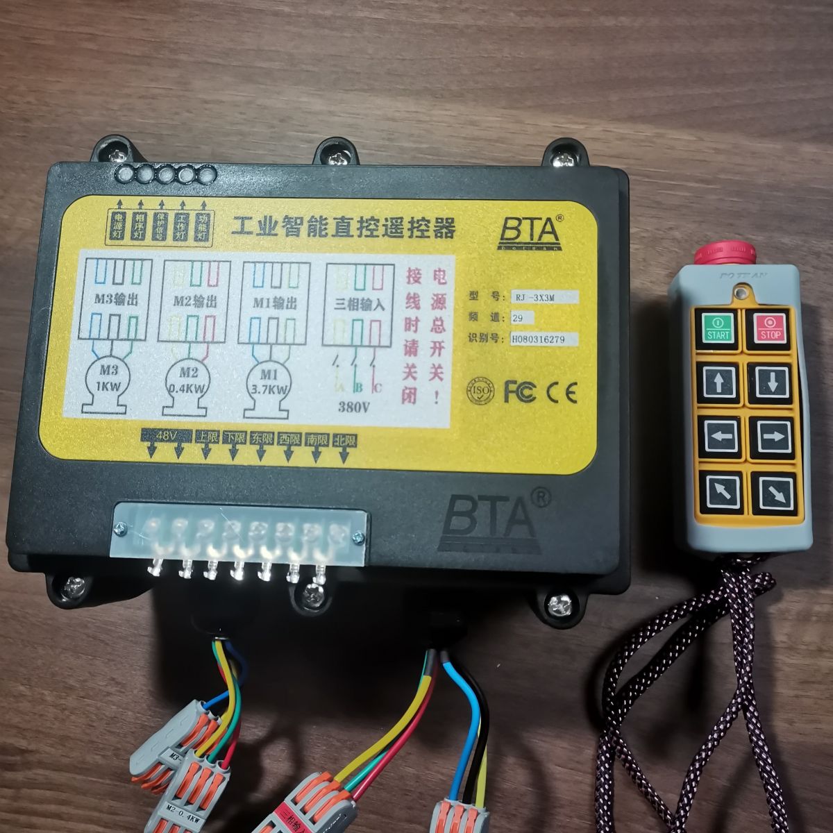 RJ-3X3M工業(yè)智能直控遙控器是我公司針對(duì)小型環(huán)鏈電動(dòng)葫蘆、鋼絲繩電動(dòng)葫蘆起重機(jī)研制的一款控制箱+遙控接收裝置。本工業(yè)智能直控遙控器集成了電動(dòng)葫蘆控制箱和遙控器雙重功能,接收機(jī)內(nèi)部設(shè)置了經(jīng)過(guò)特殊消弧處理的大電流控制觸點(diǎn),可以經(jīng)受點(diǎn)擊長(zhǎng)期頻繁作業(yè)考驗(yàn)。同時(shí),接收機(jī)具有缺相及相序保護(hù)功能和指示,每個(gè)方向均有限位輸入;可串接各種安全保護(hù)開(kāi)關(guān)(客戶(hù)自備)。